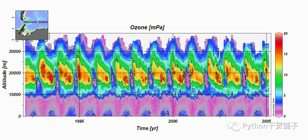 继续看看使用ODV制作出的图形心动一下,就可以去下载安装使用了。比如下图这个不同高度上臭氧的分布情况