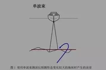 图1 使用单波束测深仪探测形态变化较大的海床时产生的误差 $ p& U' ^$ p' n6 n: z/ }
