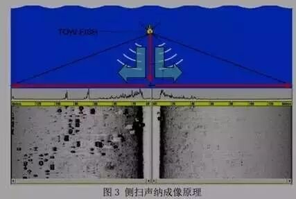 ! {& \' Q: R) f, u* d8 @' W 8000型侧扫声纳为例,可在航速20节的条件下获得高清晰度的海底图像。侧扫声纳利用拖体两侧的换能器发射、并接收信号,然后根据信号强弱反演海床形态(图3),因此也被商家冠以“地貌仪”的噱头进行推广。