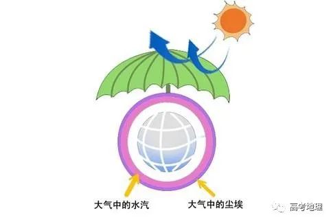 B: D7 A% Y3 c# k0 W# _  地理520公众号ID:dilizhishi520 阳伞效应READING阳伞效应·定义阳伞效应又称微粒效应。存在于大气中的颗粒物,一方面反射部分太阳光,减少阳光的入射,从而降低地表温度;另一方面也能吸收地面辐射到大气中的热量,起着保温作用。两者相比,前者大于后者,因此总的效应是使气温降低,这就是所谓的阳伞效应。 5 o6 o: p5 P9 x# q' I3 [