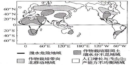 ⑵ 据图分析温室效应将对下列地区农业产生的影响: