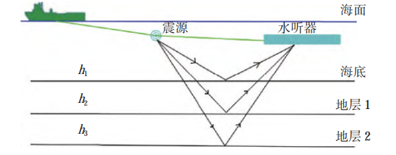 单道地震技术是用人工方法产生地震波(如电火花震源、气枪震源等),地震波经海水穿透海底,地下地层反射、折射返回海面,使用水听器等装置以一定的观测方式接收这些返回的振动(图3),机械振动转化为电信号后,通过一系列的数字信号转换,得到波形和时间的地震记录,经数据处理后得到地震时间剖面,根据时间剖面与时深转换的最终成果推断海底地下地质构造的特点。单道地震一般选择低频率声波脉冲激发,探测深度根据激发能量可以达几米到几百米,对于海底较深的地质构造、岩矿体、油气资源、海底断裂等有较好的探测效果。