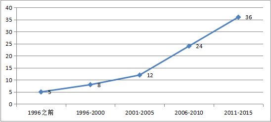 7 v) c9 S- p, y* e/ E 图二: 海洋环保组织的成立时间分布 1 J5 m' Q1 t$ ` X0 l: W* W
