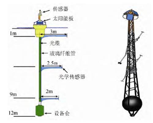 7 O; j% A5 \4 L# n$ |' D# g8 ] 以光学技术为基础,可连续观测海面、海水表层、真光层乃至海底的光学特性的浮标。第一台光学浮标于1994年诞生在美国,此后,英国、日本和法国等发达国家也研制了自己的光学浮标,代表产品有美国的MOBY和法国的BOUSSOLE,如图10所示。 9 r6 e7 o/ p* Y4 h5 F! X! h