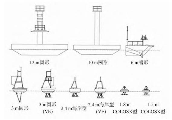 % x- q3 k9 g$ e4 u* Q( m 海洋资料浮标观测技术应用的优秀代表是美国国家海洋和大气管理局(NOAA)的国家资料浮标中心(NDBC),其管理的海洋资料浮标遍布全球,锚系浮标包含了从12m到1.5m直径的多个系列,如图1所示,长年工作于海上提供了大量珍贵的海洋数据。