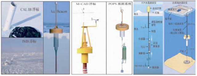 1 C( x# G4 [: ^& A* v* O+ U) X' D$ w; y$ ? 布放于南北极海冰区域能够观测包括海冰在内的海洋环境参数的浮标,既可以监测海冰自身的热力及动力过程,同时可以加载相应的海洋及大气参数观测的传感器,用于海洋及大气边界层物理过程观测。当前,有7种以上常用海冰浮标适合于南北极海冰地区的观测,如图11所示。 " Y) U1 f$ q4 V3 j/ _" M! f