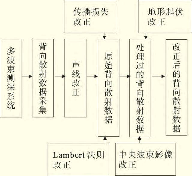 7 K" R" k, ]; w% x5 B8 F 多波束测深数据的精细处理是底质类型识别的重要步骤,是获取高质量背向散射图像的基础:在完成数据初步处理后,采用专业的数据处理软件进行人机交互处理,最大限度剔除多波束干扰(跳变或边缘等)数据对背向散射数据的影响。背向散射数据的改正主要包括时间增益改正、波束照射区面积改正及地形改正(图1)。