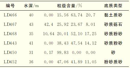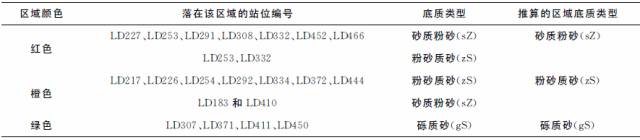 " \% ~" k& m7 \! B 从图4和表3可以看出,红色区域主要以砂质粉砂底质为主;橙色区域主要以粉砂质砂为主;绿色区域主要以砾质砂为主。 . m @9 E3 M. h* T/ ]5 O