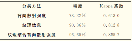 本研究分别对基于背向散射强度的SVM分类、基于纹理的比较SVM分类和结合纹理和背向散射强度的SVM分类的结果进行评估,拟寻找出最适合背向散射影像的分类方法。采用上述3种方法,对测试样本进行分类研究,样本的背向散射纹理特征和信息明细如图2和表1所示,实验结果如表2所示。