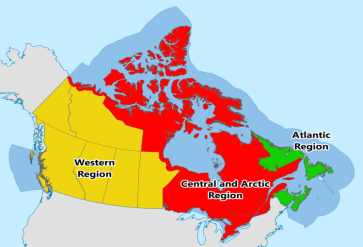 4 a% @; X3 g% S' i& H: b$ ^* e3 N, a 加拿大海岸警卫队的职责之一是海洋环境应急管理,其管辖范围分为西部区域(黄色)、中部及北极区域(红色)和大西洋区域(绿色)