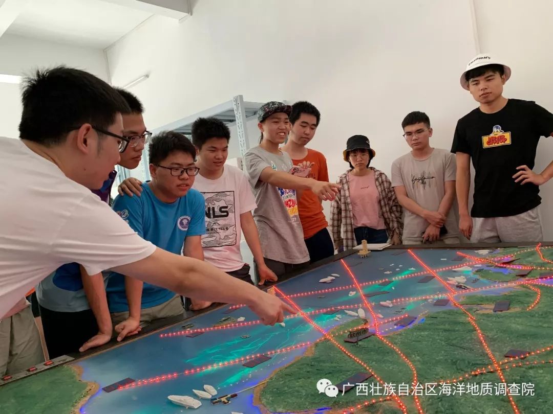 在海洋地质科普陈列室,同学们在参观中不断发出啧啧感叹。有的同学手指着广西近岸海域地质环境沙盘,发出“北部湾海洋地质环境有点意思”的感叹;有的同学对我院各类矿物标本及化石标本兴趣冉冉,感叹着“原来古代生物长得这么可爱的”;有的同学仔细观看我院在涠洲岛海洋地质调查工作中采集的岩心样品,直呼“原来涠洲岛底下石头是这样的呀”。 9 c, d/ V' x4 t& f- ]% P