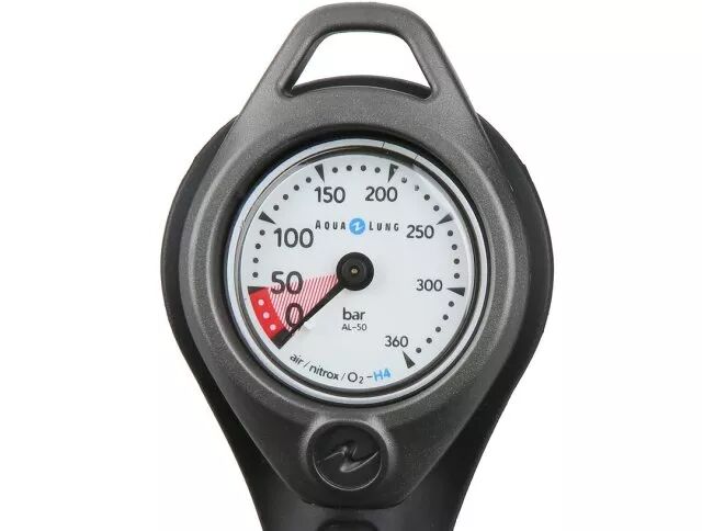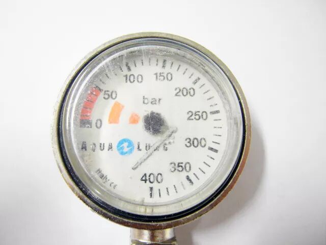 - `1 q, h& @: r+ w. B 而不同的残压表,其“0”刻度的准确度也不尽相同。一些表盘在0~50Bar气压之间会采取4等分,即用“0”指代实际残压10气压。这样做的目的,是让我们在发现指针的指示指向“0”(正确来说是10气压)之后,还留有尝试紧急浮力上升到水面的机会。 ; i) g" s; }' {/ [0 I4 ?