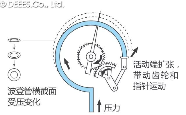 2)此时活动端向外扩张,产生与压力大小成一定关系的位移。一般C型波登管的移动范围是2~5mm,而盘旋形或螺旋形的位移范围更大;