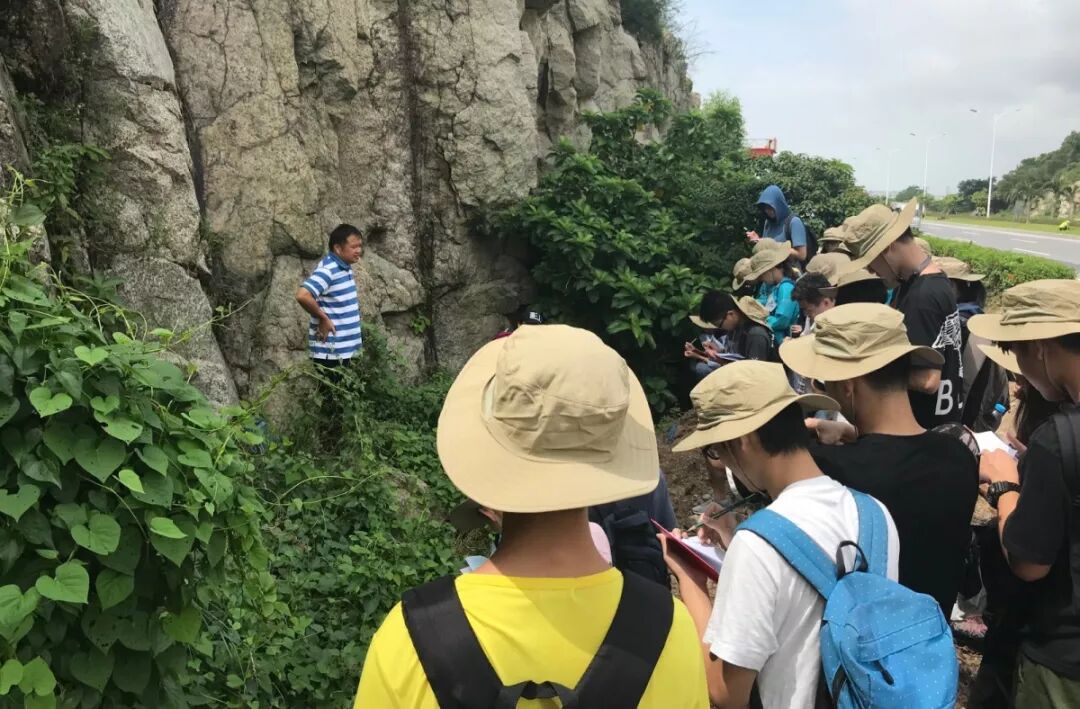 2019年7月17日,在实习的最后一天,我们来到广州市莲花山风景区。先在景区外观察了岩层平行不整合接触关系。两层沉积环境不同,化石存在状况不同,岩石有突变,说明沉积间断,形成平行不整合。随后大家进到景区内的狮子石观察古海蚀作用,老师先抽取部分同学来现场讲解、分析,然后再进行补充。“由古海蚀作用我们可以分析什么呢?可以分析沉积环境的变化,对于研究海平面升降具有重要意义。”