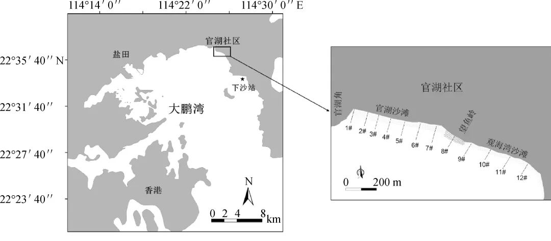 , V0 }( z$ k& I; m1 F 官湖海滩位于大鹏湾东北部,近年来年际间呈西侧淤积东侧侵蚀的趋势,尤其官湖社区前沿海滩侵蚀退化尤为显著,海滩养护工程亟待制定。对于养护方案的选择,岬湾型海滩与开敞型海滩也有所不同,应当依据不同的退化原因进行合适的方案比选,例如岬湾型海滩的特征岬角受到破坏,应当优先修复岬角构建静态平衡岬湾进行补砂修复,或者由于岬湾型海滩独特的地形条件而引起的差异性季节输沙,应当对流失沙体情况严重的剖面着重补沙,亦或是选择流失率最大的季节进行养护补沙工作,减少不必要的人力物力消耗等等,均需要对岬湾型海滩的季节性变化规律进行研究。为支撑海滩的退化原因分析与养护方案制定,于2020—2021年开展了官湖海滩剖面测量,本文基于此,深入分析研究海滩的季节性变化特征与原因,一方面能够加强对华南区域大鹏湾海滩季节性变化特征的认识;另一方面,可为相关岬湾型海滩的养护方案制定提供科学依据。