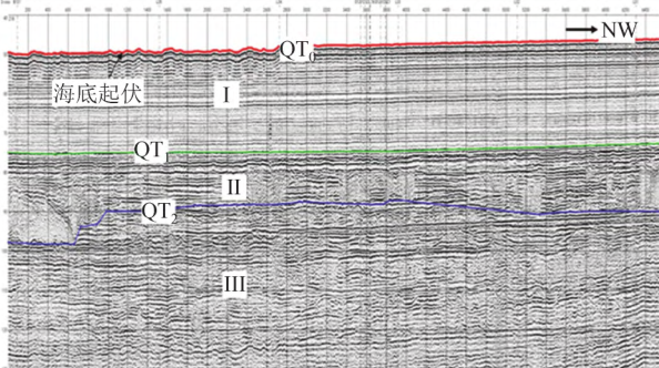 调查区内浅地层剖面测量自上而下连续追踪了QT0(海底面)、QT1和QT2等3个反射界面,相应地层划分为Ⅰ、Ⅱ和Ⅲ3个层组。其中第Ⅰ层组为淤泥质土层;第Ⅱ层组为黏土层,部分区域存在砂性土;第Ⅲ层组整体为黏性土层,下部部分区域为砂性土层,如图2所示。 T# K8 X& h; b