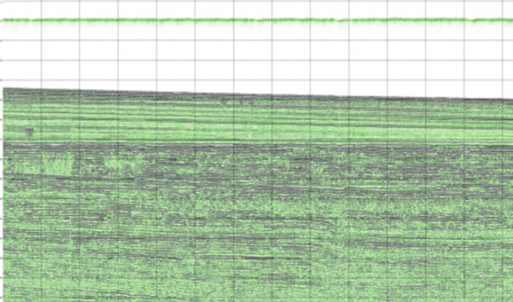 在该风电场建设的前提勘探中,海洋物探方法可以顺利采集海底地形数据。例如,使用浅地层剖面仪器对烟台某海域海底地形数据进行采集,所得到的成果图利用浪涌校正处理、数据增益处理、滤波信号处理等方式进行处理后,可以得到清晰度较高的海底地形图。地形图中存在非常清晰的海水与淤泥分界线,从结果图可以了解到该区域的海底地形整体上比较平坦,初步满足建设风力发电场的条件。