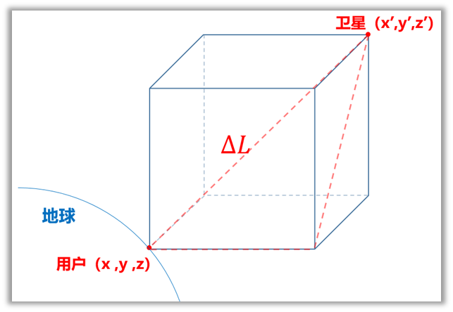 地球表面的任何一个位置,都有它的三维坐标,也就是经度、纬度和高程。它头顶上的GNSS卫星,也有自己的三维坐标。那么,我们把整个空间看成一个坐标系,可以画一个立方体。立方体的两个对角,分别是用户和卫星,根据中学立体几何的知识,我们可以知道,卫星和用户之间的距离△L(这个距离也被称为“伪距”),是:  z9 x& T" x5 s: z! S: s: I