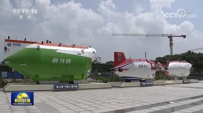 + V3 G) Q" P# w5 T U" E8 ^8 q “奋斗者”号、“深海勇士”号以及“蛟龙”号的合照(图源CCTV)