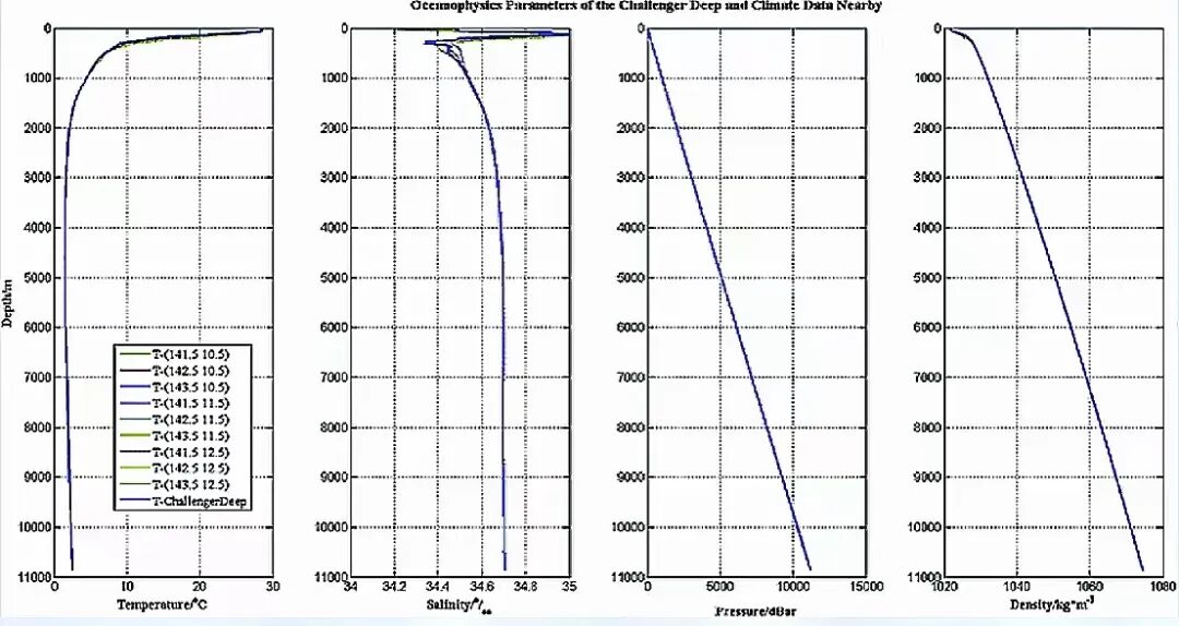 深海环境随着水深部分参数变化,从左到右依次是温度、盐度、压力、密度(图源researchgate.net) + W" B3 ]7 e9 }1 `! T0 ^& b