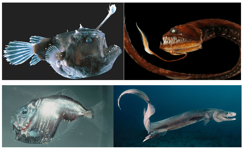 6 e7 Z/ N Z$ }# N 马里亚纳海沟有许多我们未曾听闻的深海鱼,如鮟鱇鱼(angler fish)、深海龙鱼(deep-sea dragonfish)、斧头鱼(hatchet fish)以及堪称“活化石”的褶边鲨鱼(frilled shark)(图源centerforsurfresearch.org) ) E/ f' G- j' y: G( J