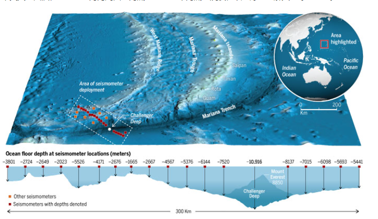 马里亚纳海沟位置及深度示意图(图源science.org) ! G9 ^; v/ T& M+ ]! i* V8 O n# Z