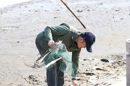 科普活动后,志愿者一行来白沙河的入海口,开展净滩、护鸟、观鸟。数百只反嘴鹬、黑尾鸥在海滩中觅食,还共同救护了一只尾翼受伤的国家2级重点保护鸟类一一比利时国鸟红隼。