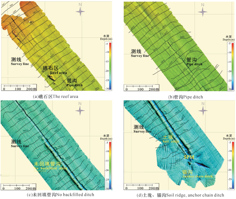 在近岸登陆段,受潮流、人工开挖管沟的影响,海底起伏凹凸不平,表现为崎岖海底地形(图2a);在中间段,海底地形平坦,海底管道基本处于埋藏状态(图2b);在近单点系泊处,在管沟一侧发现有未回填形成的高土垅(图2c)。此外,在锚链的影响下,海底底部形成了数条锚沟,海底地形局部有较大起伏变化(图2d)。 # D% X: I4 ^! e6 u