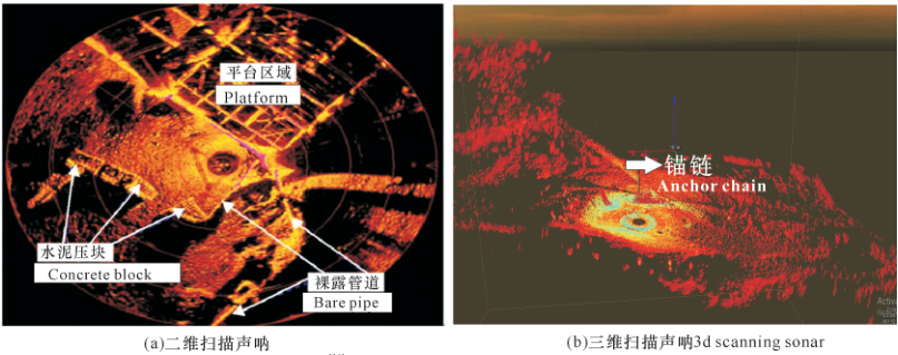 $ |% I+ H7 B! a2 P) U# \/ c 扫描声呐是目前比较先进的用于海底管道检测的声学探测技术,其采用海底支架静态布放测量的方式,具有实时探测、操作简单、成像清晰的特点。其工作原理是利用换能器发射声脉冲,通过对回波信号的接收和处理形成图像,然后定点旋转探头,重复发射接收的过程,形成完整、清晰、精确的海底图像。扫描声呐包括二维扫描声呐、三维扫描声呐,如Kongsberg公司的MS1000二维扫描声呐、Blueview公司的BV5000三维扫描声呐。图5展示MS1000二维扫描声呐、BV5000三维扫描声呐在海底管道外检测中的应用效果。扫描声呐对海底裸露管道、锚链等具有非常直观的显示,成图清晰、识别准确,能清晰展示探测目标的水下三维结构,在海洋平台、单点系泊等附近区域以及海水浑浊、能见度低的海水区域的管道探测发挥了重要作用,具有很好的推广性和适用性。 0 o2 D# X+ X( `+ t# i- Q