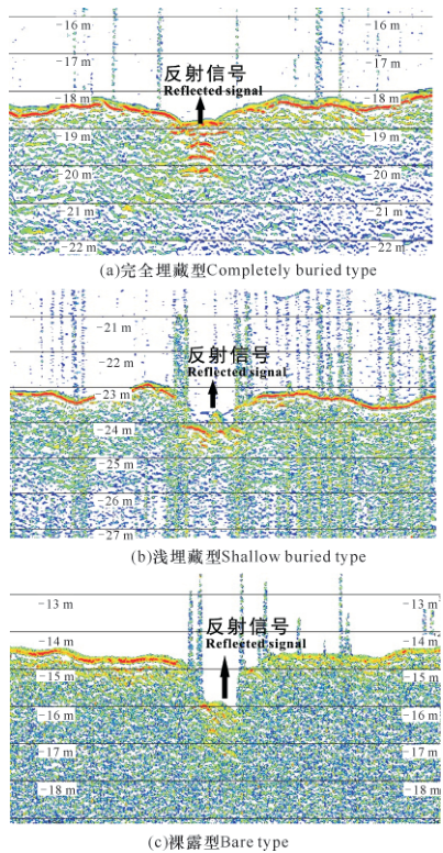 4 @! Y7 a. Q V$ B% n 根据调查区海底管道的技术参数和铺设施工完工方法定义,完全埋藏型管道埋藏深度大于0.5m,浅埋藏型管道埋藏深度小于0.5m,裸露型管道埋藏深度为0m,管道部分或是全部裸露在海底。根据SES2000参量阵浅地层剖面系统测量分析结果,考虑到管道直径大小和埋藏方式的不同,在研究区识别出完全埋藏型、浅埋藏型和裸露型3种管道赋存状态(图4)。 + k/ s: l k! i8 g2 @0 @