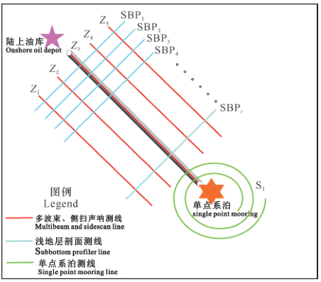 . z" v" F2 ~# R. j3 ~* T 图1 海底管道调查测线布设示意图