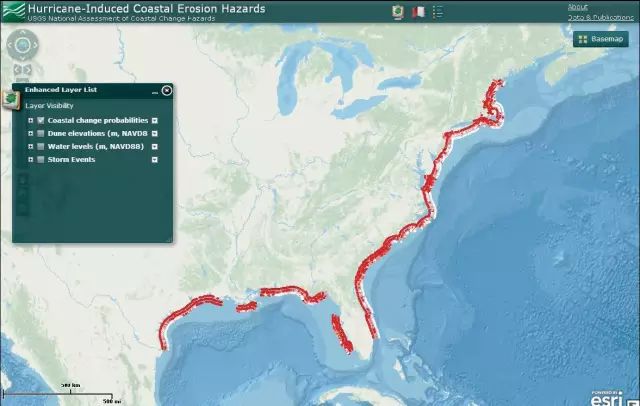 海岸带变化对沿海社区构成的潜在风险在美国全国都存在。强大的风暴产生的浪涌、波浪和洋流可以搬运大量的沉积物,破坏道路、建筑和其他关键基础设施以及改变自然栖息地。美国地质调查局进行一系列研究来引证、评估和建立海岸带变化、风险和脆弱性的模型,包括历史海岸线变化、地质构造和海岸带地区历史、沉积物供应和搬运、海平面上升以及极端暴雨事件如何影响海岸带变化的速率和影响。 . ]' ^8 |( L- v& y