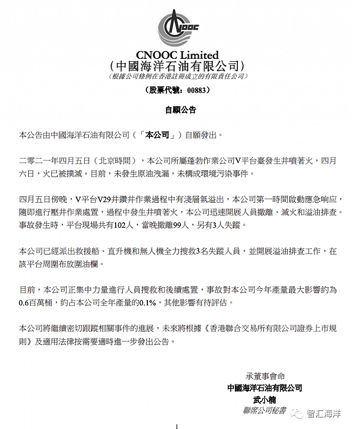 公告称,四月五日傍晚,V平台V29井钻井作业过程中有浅层气溢出,本公司第一时间启动应急响应,随即进行压井作业处置,过程中发生井喷着火,本公司迅速开展人员撤离、灭火和溢油排查。事故发生时,平台现场共有102人,当晚撤离99人,另有3人失踪。