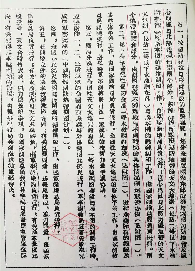 国家测绘总局筹建初期,总参测绘局代拟了《关于国家测绘总局和军事测绘局的任务分工与业务联系问题》的报告,由国防部上报国务院。1956年5月26日,国务院批准了该报告。该报告对全国基础测绘任务进行了分工:国家腹心地区和北部边疆地带测绘由国家测绘总局负责,东部沿海和西南边疆地带测绘由总参测绘局负责。为此,总参测绘局对东部国防地带测绘任务规划做了调整。据此,两局按照统一的测绘基准和技术标准,组织各自所属测绘力量完成分工承担的全国基础测绘任务,国家基础测绘进入全面实施并快速推进时期。; G+ y& L/ \( d1 k