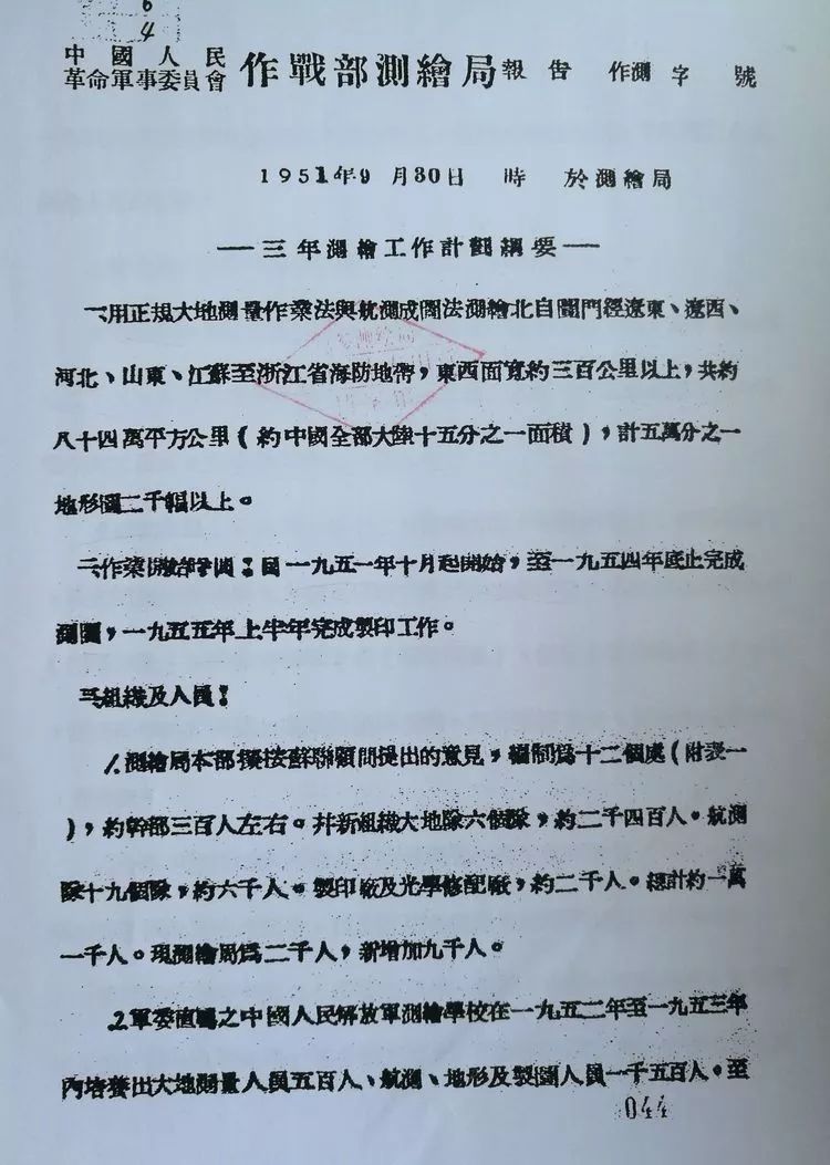 . Z4 ]( z& \' T8 K& j1 M 1950年6月,美国发动侵朝战争,将战火烧到中国边境,又将第七舰队侵入台湾海峡,直接威胁到中国东部沿海地区的安全。为做好反侵略战争的测绘准备,军委作战部测绘局根据国家面临的安全形势和中央军委的指示,于1951年9月拟定了《三年测绘工作计划纲要》(见图片),计划在3年内完成东部沿海地区约84万平方千米的1:5万地形图测绘。该项计划后进行多次调整,形成了最终的《东部国防地带测图纲要》。