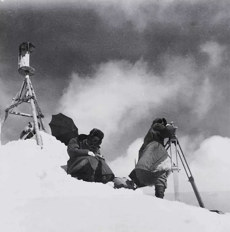 ) q+ t6 T9 p' f" k; h 图为1971年,福州军区第2测绘大队在西藏日土地区执行会战任务时,作业人员在雪山顶上观测。
