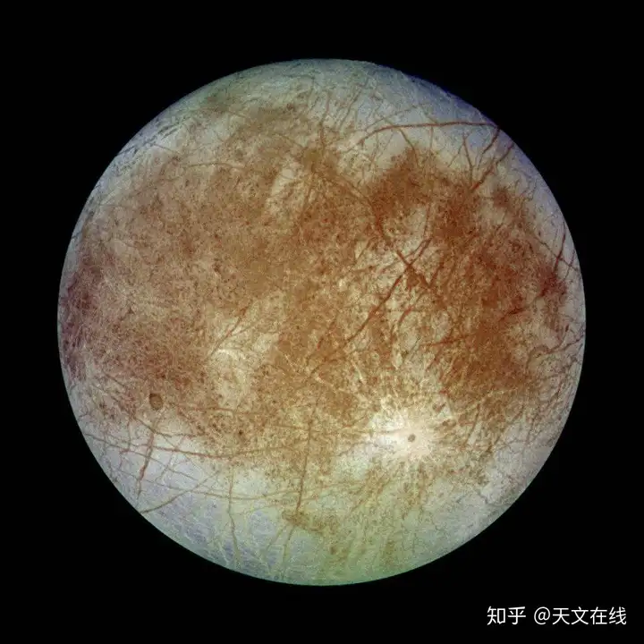 图解:木卫二背向行进方向的半球。右下角的白色区域为普维斯撞击坑,深色区域是木卫二水冰表面矿物含量较高的区域。图像颜色近似真色,于1996年9月7日由伽利略号拍摄。 2 y5 d' o7 d9 c1 n8 v2 _