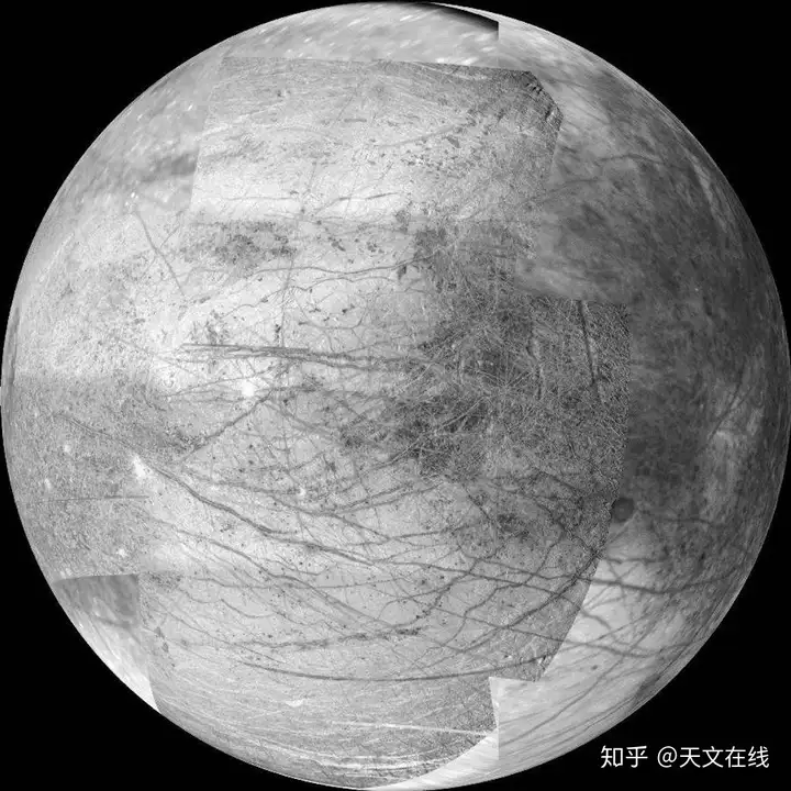 图解:这个12帧的马赛克拼图提供了有史以来针对位于木星一侧、正对着木星的木卫二的最清晰的分辨率。它于1999年11月25日在美国宇航局先前的木星及其卫星探测计划里通过伽利略号航天探测器的相机拍摄获得。(来源:美国宇航局/美国宇航局喷气推进实验室/亚利桑那大学) 0 U' T) W4 u" \1 R# S