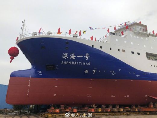 2018年12月8日,我国首艘载人潜水器支持母船“深海一号”在武汉顺利下水。从今往后,“蛟龙号”有了自己的专用母船,我国又添一大洋调查利器。“深海一号”船长90.2米、型宽16.8米、设计吃水5.8米、型深8.3米,设计航速16节以上,续航力超过12000海里,设计排水量4500吨。在额定人员编制情况下,自持力为60天,可在全球无限航区执行下潜作业。 0 ?9 j) e F$ S& L9 g I