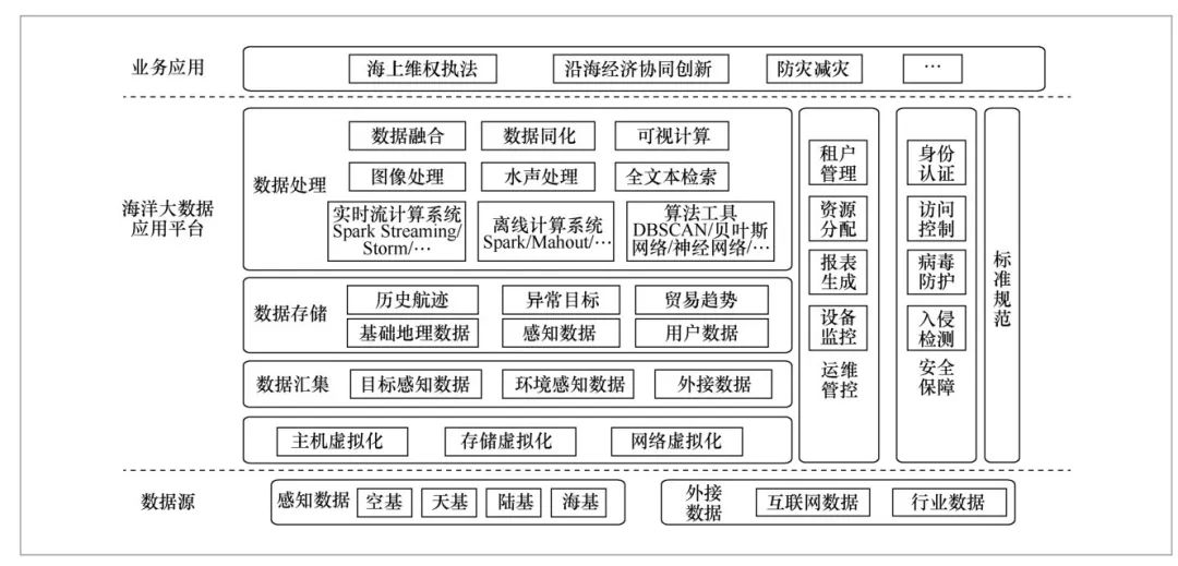 海洋大数据应用技术平台基于云计算架构,搭建包括数据汇集、数据存储和数据处理的大数据业务处理系统以及运维管控、安全保障、标准规范3个支撑体系,如图1所示。