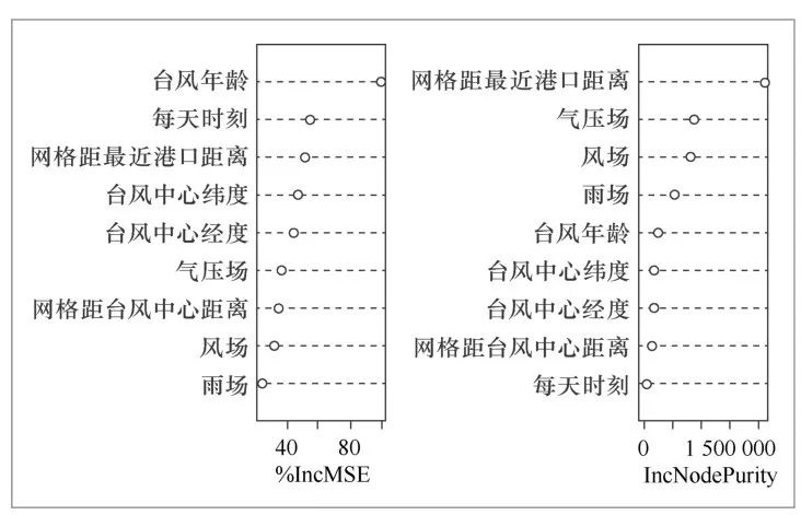 表3和图3显示了随机森林模型的特征重要性降序排序结果。随机森林对连续变量设置了两种重要性,一种是平均均方误差减少百分比(%IncMSE),另一种是平均节点不纯度下降量(IncNodePurity)。变量重要性排名第1位的是台风年龄(台风生成后的时间);排名第2位的是每天的时刻,说明白天或夜晚船舶的行为响应不同;排名第3位的是网格距最近港口距离;排名第4位的是台风中心纬度;排名第5位的是台风中心经度;排名第6位的是气压场;排名第7位的是距台风中心距离。风场和降雨场的影响较小,其原因可能是,台风登陆带来大风强降雨之前,船舶已经进入避风港,并将持续停留,直到大气和降雨天气好转。另外,两种特征重要性定义不同导致其排序的结果也不同。这是由于预测变量船舶密度是空间变化的,而某些特征因素是纯时间(如台风年龄),因此虽然在%IncMSE重要性上影响很大(加噪声后的误差),但由于缺乏空间分布信息,它们在IncNodePurity的重要性排序并不高。 + p9 Q1 y1 ~( |2 r