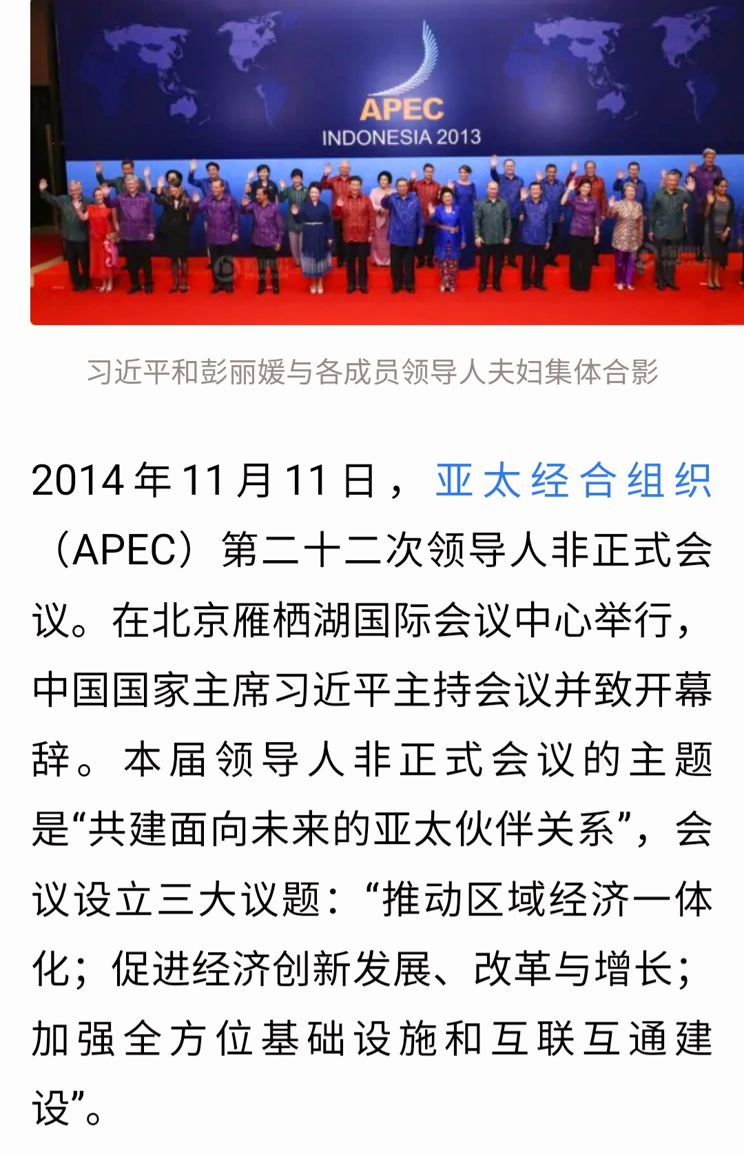1 v8 {. }: O' _' E1 U( n) w, c亚太经合组织(Asia-Pacific Economic Cooperation, APEC)是亚太地区层级最高、领域最广、最具影响力的经济合作机制。APEC现有21个成员,分别是澳大利亚、文莱、加拿大、智利、中国、中国香港、印度尼西亚、日本、韩国、墨西哥、马来西亚、新西兰、巴布亚新几内亚、秘鲁、菲律宾、俄罗斯、新加坡、中国台北、泰国、美国和越南。此外,APEC还有3个观察员,分别是东盟秘书处、太平洋经济合作理事会、太平洋岛国论坛秘书处。APEC工商领导人峰会是APEC经济体领导人共商亚太重要事务、推动贸易自由化与经济合作的最高级别峰会。峰会在APEC领导人非正式会议期间同期举行,有力的表明APEC致力于加强私人机构与公共部门的交流和合作。" d5 v; X+ D( P% q7 g0 K6 L/ V