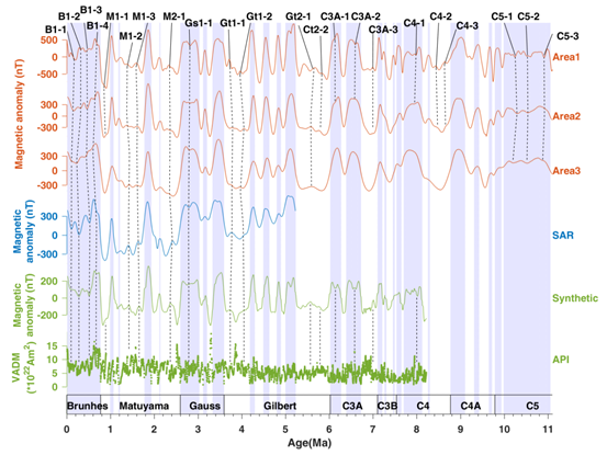 除了沉积物,从大洋中脊下喷出大量玄武岩形成洋壳。这些洋壳也是能记录地磁场信息的良好介质。基于新的算法与严格的数据检验,南方科技大学海洋科学与工程系海洋磁学(CM2)团队通过对洋壳上观测到的海洋磁异常数据的处理和分析,构建出目前最长的(11百万年以来)连续的球磁场强度变化曲线。