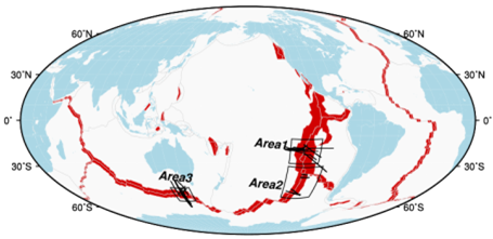 图1 三个研究区域的位置图。图中红色阴影表示0-11 Ma的洋壳分布,黑线表示每个区域挑选出来的磁异常剖面。