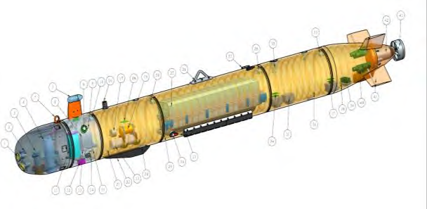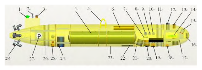 ! J9 F6 n! g. p6 C) \; A# J 1-卫星定位装置天线;2-电台天线;3-频闪灯;4-耐压舱;5-吊钩;6-侧扫声纳电子舱;7-深度计;8-水声通信设备电子舱、9-水声定位设备电子舱、10-定向导引声纳电子舱、11-垂直推进器(前)、12-水声通信设备换能器、13-水声定位设备换能器、14-CTD、15-抛缆装置、16-前视声纳、17-定向导引声纳换能器(水平阵)、18-上浮抛载装置、19-下潜抛载装置、20-DVL、21-水下相机闪光灯、22-定向导引声纳换能器(竖直阵)、23-浮力材料、24-水下照相机、25-平衡抛载装置、26-垂直推进器(后)、27-尾部横向推进装置、28-尾部主推进装置 ' Q9 a1 L% F- t) w( e