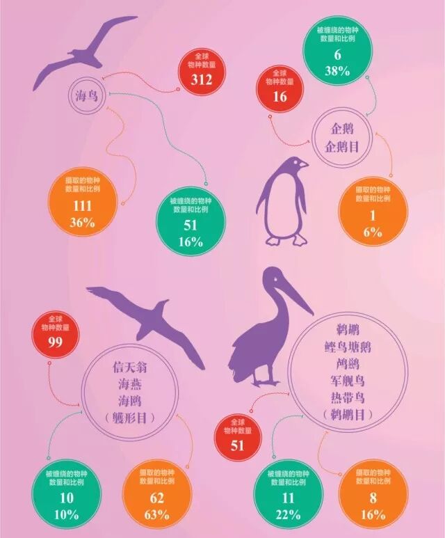海鸟虽然不以海洋作为栖息地,但其食物主要来源于海洋。野外调查发现,在许多海鸟的消化道中会不同程度地含有微塑料,海鸟对塑料颗粒的摄食与塑料的形状、大小以及颜色等密切相关,与海鸟的天然食物相似度越大的微塑料在海鸟体内含量越高。但由于海鸟体内不含有消化塑料的酶类,所以摄入的一些塑料碎片将在其消化道内长期存在,影响食物的正常消化,导致摄食障碍和发育不良。