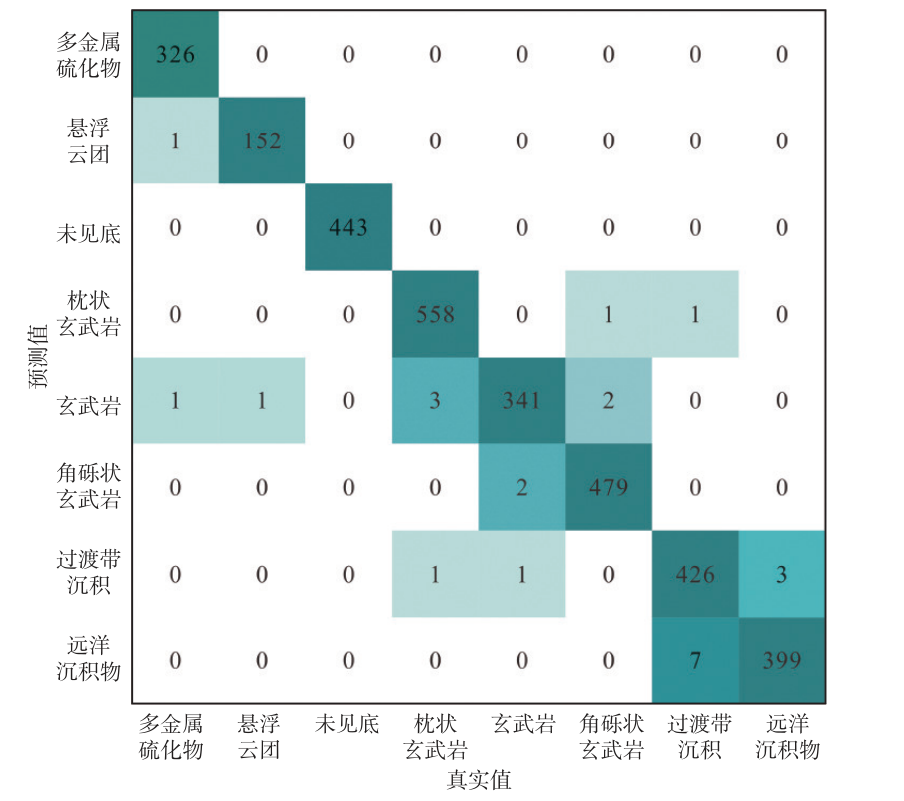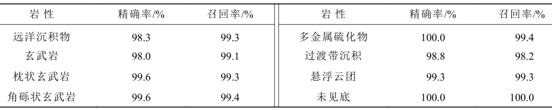 9 ~, f, j# ]. A5 q- _& o$ F 由表3可知,模型对多金属硫化物识别较为准确,精确率接近100%,召回率约99.4%;未见底类别的识别精确率为100%;对远洋沉积物的识别准确率较低,为98.3%,而玄武岩类识别准确率约98%。