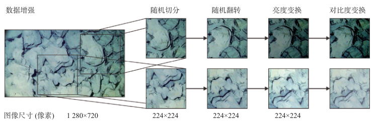 利用Python的transforms函数对数据集进行数据增强。数据增强方式为通过随机切分、随机翻转的方式模仿摄像机与海底相对位置的变化,以及通过亮度变换和对比度变换的方式模仿水下色彩失真程度的变化(图4)。 7 r% ?& W9 [' c4 ~9 R