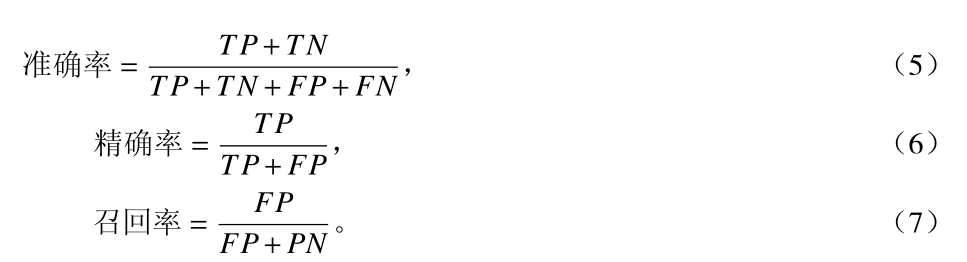6 Z" ]: ^. t2 J1 j* u3 V 准确率、精确率、召回率是分类任务中重要的度量指标,将被用于评价ResNet模型性能。3个指标可由式⑸~式⑺表述: