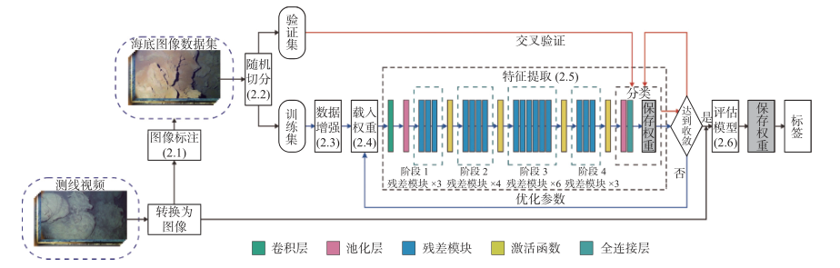 本研究技术流程如图3所示。首先,预处理视频数据,建立海底图像数据集,将其划分为训练集和验证集并进行数据增强操作;然后,搭建深度学习模型进行训练,载入训练集,基于迁移学习训练模型,并与验证集交叉验证;再进行多次实验以优化参数,模型达到收敛后保存分类权重信息;最后,将分类权重应用于识别调查测线。 ) H5 Y) Q3 F: h$ V9 m8 x/ |3 i! u